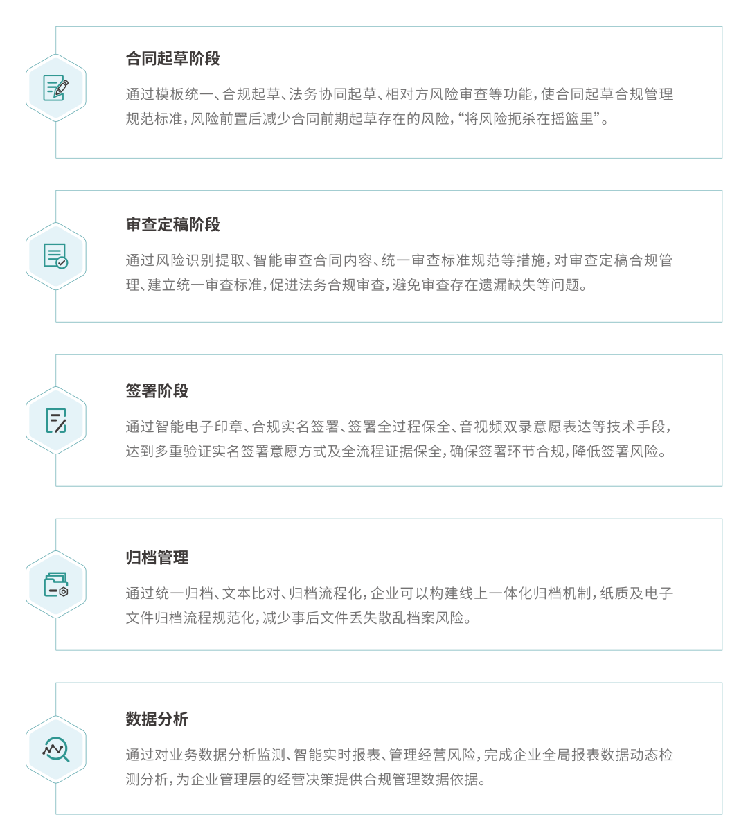 不仅覆盖各类应用场景,企业合同数智化管理还能够在合同全生命周期的各阶段提供多方面助力,包括规范业务流程、**经营风险,提升企业管理及经营决策能力,维护竞争优势,为企业创造价值。