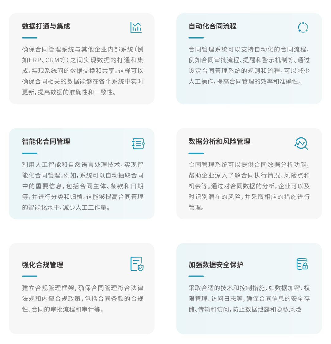 而合同管理是企业内部重要的信息流之一,对于企业的运营和风险管理至关重要。 在数字化转型推进的过程中,建立专业智能化的合同管理系统可以提高合同管理的效率和准确性,解决系统数据打通和系统间协同的挑战,**合规和法律风险,这对于企业的数字化转型推进和内部管理提升都具有重要意义。