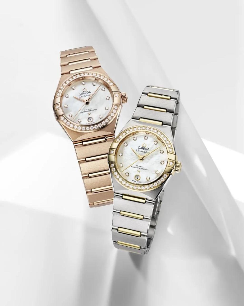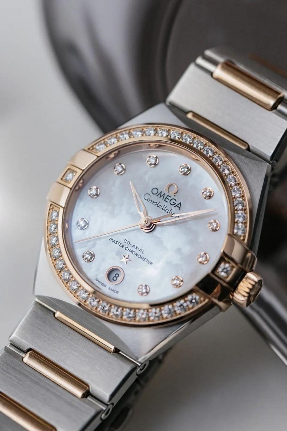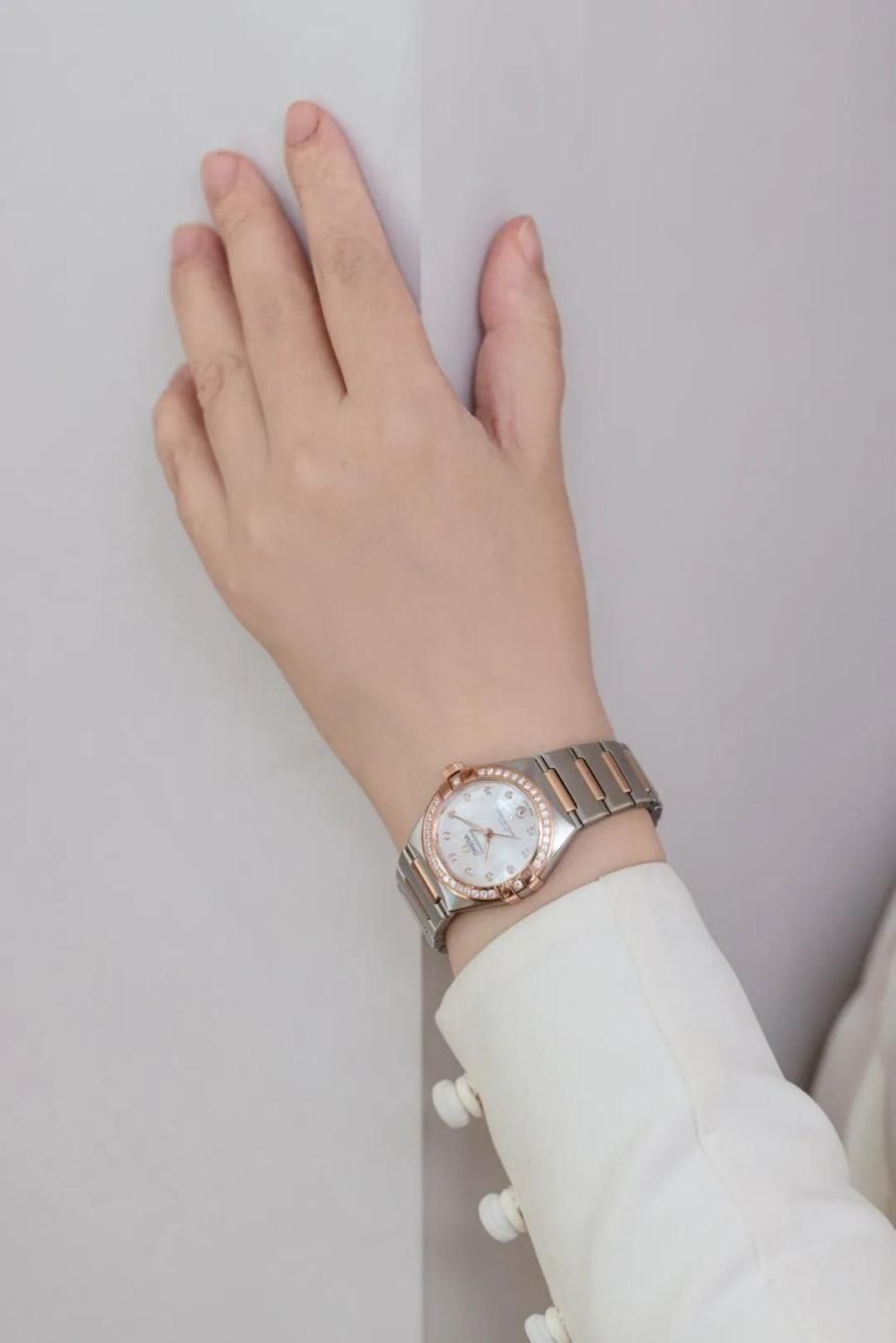 如今整个星座家族选择**丰富,不同的材质、尺寸、盘面颜色都分得非常细,只要是你想到的,几乎都能在星座系列里找到。我个人很偏爱这枚29毫米女士手表,它也是刘诗诗同款,小巧精致的间金款女神气质拉满。镶钻表圈搭配珍珠母贝表盘,小时刻度也镶嵌钻石,美钻在精心设计的底托映衬下,格外立体璀璨。