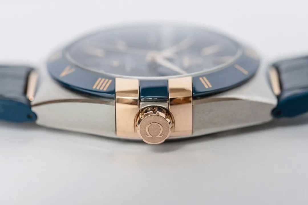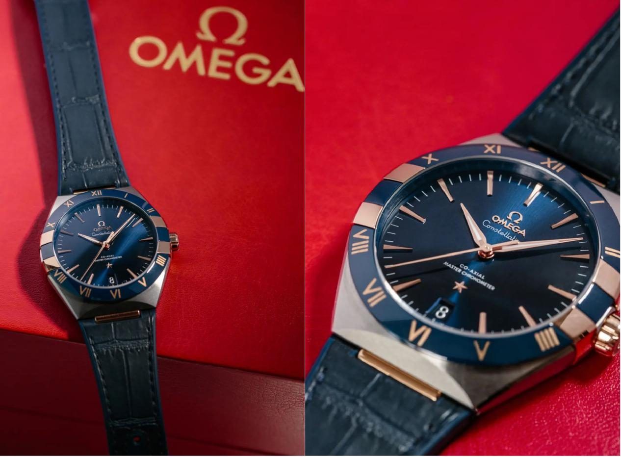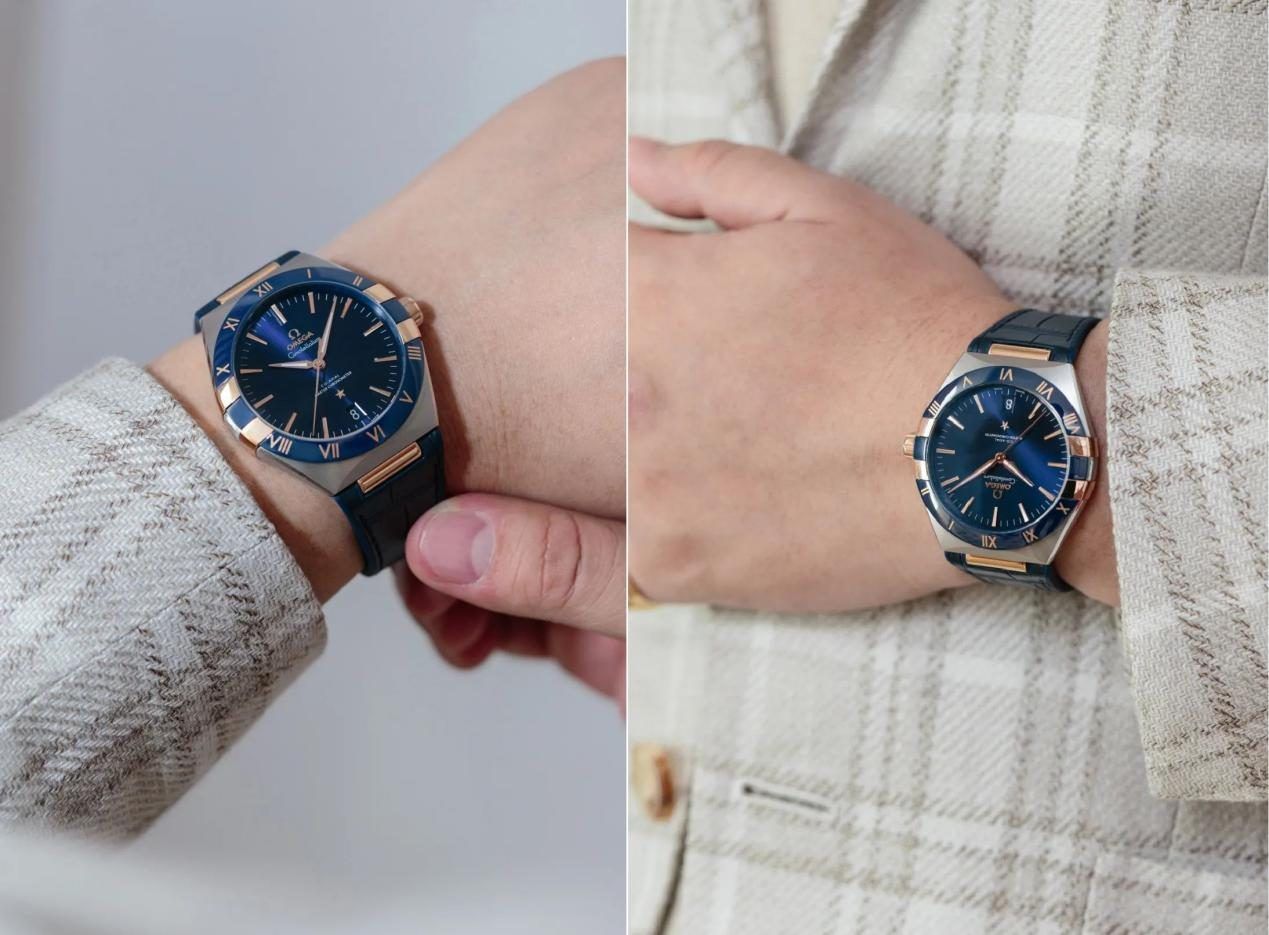 这枚欧米茄星座系列41毫米男士手表也非常受欢迎,材质同样是精钢与Sedna 18K金,搭配蓝色抛光陶瓷表圈,感觉摩登现代,把精致与运动感平衡得刚刚好。细节也非常耐品,陶瓷表圈上的金色罗马数字由OMEGA Ceragold特殊技术制成,看起来非常光滑闪亮,也和Sedna 18K金打造的指针时标、欧米茄logo与星徽标识相得益彰。蓝色表盘呈现出太阳射线打磨效果,从表盘的星徽标志向外发散,6点位设有日历窗,盘面布局和谐,令人忍不住静静欣赏。