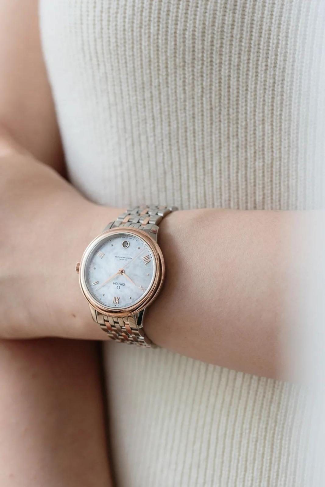 这枚碟飞系列典雅女士手表的直径是34毫米,采用精钢和Sedna 18K金材质 白色珍珠母贝表盘,整体色泽柔和雅致。内部是欧米茄8800**天文台机芯,同样拥有背透设计,性价比很高。表壳正面延续了碟飞经典的“三层式”设计,简洁开阔的表盘更为清晰易读。罗马数字和圆点时标交替出现,再加上圆点分钟圈,把简约美学诠释得淋漓尽致,还让表盘充满有趣的韵律感。