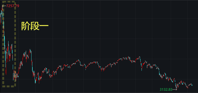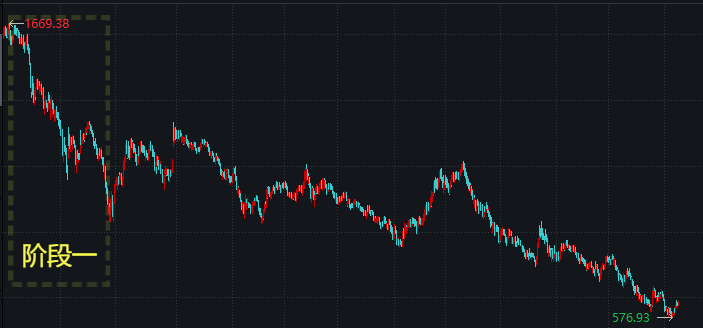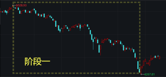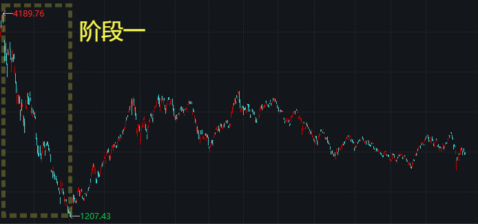 **阶段:暴跌。牛市过后,几乎市场上的股票都是高估的,所以跌的时候,也是大部分股票一起暴跌。
