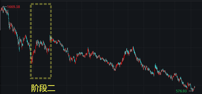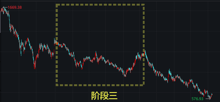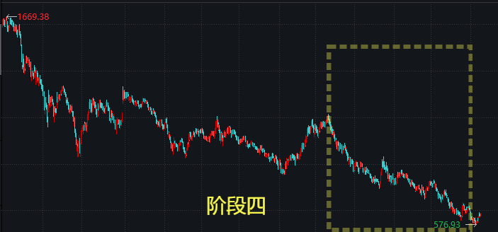 第四阶段:阴跌。所有股票都下跌,阴跌、慢刀子炖肉,给人心理上造成的痛苦不亚于**阶段的暴跌。