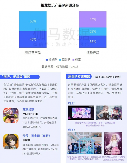 祖龙娱乐在IP多产品线覆盖、原创IP打造方面已显现较大潜力。在借助经典IP的知名度赋能产品的前提下,祖龙娱乐通过探索更多玩法拓展品类矩阵,例如在曾产出超40亿元流水产品的“龙族”IP上,祖龙娱乐一方面增加产品产出,另一方面采取“同IP、多品类”策略,满足不同品类玩家的需求,实现IP覆盖用户的互补,从而**化IP价值。在扩大授权IP储备的同时,祖龙娱乐也塑造着原创IP,以多端发售等形式兼顾流水与品牌,以创作UGC及实体化游戏内服装等形式提升其在核心用户中的口碑。而其率先于“龙族”IP试水的“同IP、多品类”策略,也有望在原创IP中带动更大价值。