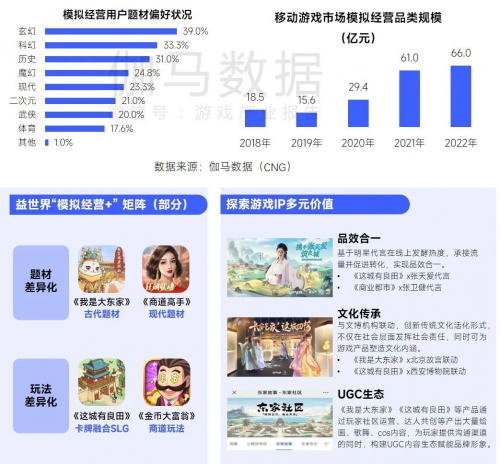 益世界或借力差异化实现细分赛道突围,提高潜力上限。模拟经营品类市场规模自2020年迅速上涨,2022年已达66亿元,而益世界在模拟经营品类持续深耕,孵化出《金币大富翁》《我是大东家》等多款长线运营产品,在模拟经营赛道中位列头部地位。在包含模拟经营元素的产品品类及题材愈发多元化的趋势下,益世界通过玩法、美术、题材的横向拓展多方向发掘细分市场潜在空间,例如现代商道类产品《商道高手》、策略经营类产品《这城有良田》等。值得注意的是,受海外模拟经营的融合玩法较单一的影响,益世界“模拟经营 ”的布局在海外或同样有效,《商道高手》在日本市场长线运营已展现部分潜力。同时,多款差异化模拟经营产品也帮助益世界建立起立体的“模拟经营 ”品牌形象。此外,益世界不断发掘旗下产品IP价值,以品效合一、构筑UGC生态等形式塑造原创IP,有望在细分品类中激发更长远的潜力。