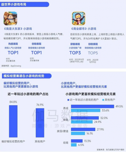 此外,伽马数据认为,未来小游戏领域将呈现至少三项趋势:**,小游戏领域仍存机会,这是由于激活其潜力的因素仍然存在,即质量提升、买量成本较低、跳转链路更完善、多潜在用户 ;第二,付费优化将成创收**,这是由于小游戏用户具备内购付费、广告变现接受能力双高的优势,但对付费点、付费项目的要求与App版本有差异,因而能更早完善产品调优的团队将具备优势;第三,小游戏将更快进入高价值用户竞争阶段,这是由于竞品增加进而快速拔高获客成本,因而如果无法获取更多高价值用户,产品利润或将更快的被成本抵消。