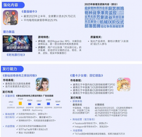 在强化内容的基础上,持续迭代多元的发行能力是青瓷游戏的**潜力。其中,内容塑造主要体现在《**蜗牛》《使魔计划》等自研产品中,其中以《**蜗牛》最为突出,在上线3年的情况下仍保持着上半年月均流水约3500万元、周均用户留存率超25%的成绩,而为实现这一成绩,《**蜗牛》也保持着较高的内容更新**。现有产品之外,自研新品《时光旅行社》的长期表现也值得关注。发行能力也是青瓷游戏的潜力之一,《新仙剑奇侠传之挥剑问情》首月全渠道流水超2亿元、《魔卡少女樱:回忆钥匙》在**港澳台iOS游戏畅销榜**均位于TOP5等的表现,是发行能力的直观体现。但从更深层来看,产品成绩或存在必然性,这是由于上述成绩是在买量、内容营销、阵地经营等合力下形成的,即以更立体的发行能力加深用户印象、渗透用户圈层。在内容能力、发行能力的双重加持下,未来,青瓷游戏或助更多产品释放流水潜力及品牌价值。