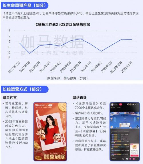 长线运营方**或为途游游戏的潜力之一,从成果来看,途游游戏专注现有品类并强化精品化研运,例如《捕鱼大作战》《次神:光之觉醒》为代表的产品均在各自的品类中表现较优,生命力稳定且仍处于健康状态。从长线运营方式来看,“经典运营方式**探索用户圈层,新兴运营方式快速挖掘精准流量”是较显著的特点,经典方式的代表为明星代言,企业联动柳岩、杨超越等多位明星;新兴方式的代表为、短视频,培养自有达人超50名。基于经典方式与新兴方式,途游游戏在发行上持续探索精细化营销及运营,从结果来看,或已沉淀出多品类的有效方**。当前,途游游戏的**关注赛道在休闲类、策略类、小游戏领域,当产出研发层面较强的产品后,结合已沉淀的方**,或有望长期保持高流水,带动企业收入持续稳定地增长。