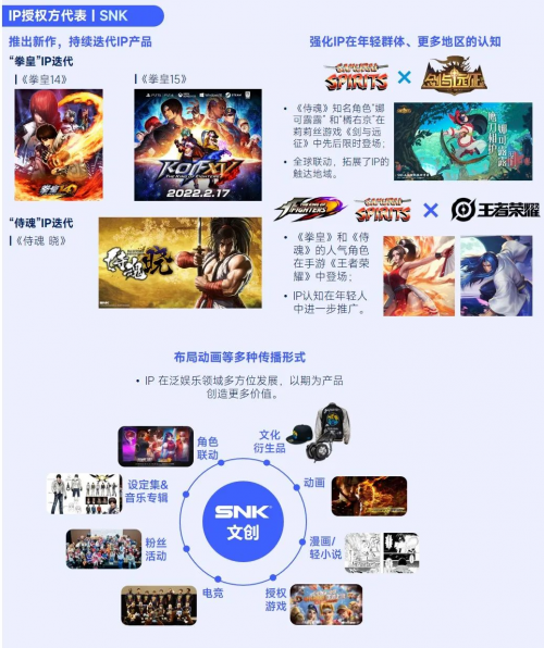 IP授权方的价值加成还体现在IP发展规划上,如果IP自身也在积极扩大其影响力与知名度,则将营造出更友善的研运环境。仍以SNK为例,旗下IP的优势在于诞生较早,其主要受众已形成强劲付费能力。在此基础上,SNK较积极地拓展IP生命力,包含但不限于持续迭代IP产品、强化在年轻群体中的渗透、加码更多地区用户认知、布局动画等多种传播形式。对于合作团队而言,这意味着在无须支付更多成本的情况下,可享受更易吸引用户游玩、更易创造内容营销素材等利好。因此,沟通IP发展规划也是合作团队选择授权方的重要考量之一。