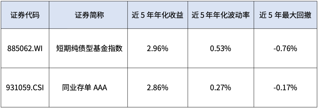 从上表中可以看到,万得短债基金指数的近5年年化收益、年化波动率、**回撤都要略高于同业存单**A指数。