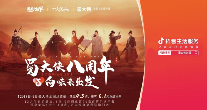 去伪存真、大浪淘沙的发展背景之下,如何穿越生命周期、拥有长久的竞争力,除了流量驱动的加持,更重要的是品牌品质和效率的提升、品牌资产的长期沉淀、品牌抗风险能力的提高。蜀大侠此次八周年庆活动在内容和玩法上创新升级,在线下联动影视IP打造主题店、落地生日活动,在线上联动平台、进行品牌跨界合作、异业联动,在间内以优质的货盘撬动门店线下业绩增长。