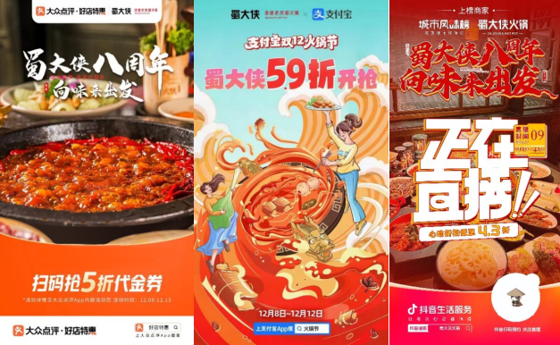 早在活动前期,蜀大侠就整合资源、聚势预热,联动了八大平台共庆,在高德打车、招商银行、云闪付、支付宝、饿了么、大众点评、滴滴等各平台弹窗、banner位及线下40 万达广告屏集中宣发蜀大侠周年庆活动信息。同时,同步推进品牌异业合作,在微博、小红书等自媒体平台联合70家 品牌一起送福利,提前预热周年庆,曝光破百万;还以达人铺排活动信息、短信精准触达私域会员、快闪群提前锁客、自媒体平台全方位宣发等形式,联动品牌私域流量与平台公域流量池,全方位助推品牌曝光。