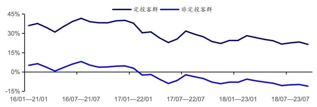 **显示,如果将参与定投和未参与定投的客群分开来看,参与定投的投资者自2016年初以来的所有时期在持有股混基金1年、3年、5年维度下的获得感均高于不参与定投的投资者,并且随着持有时间的拉长,优势更加明显。