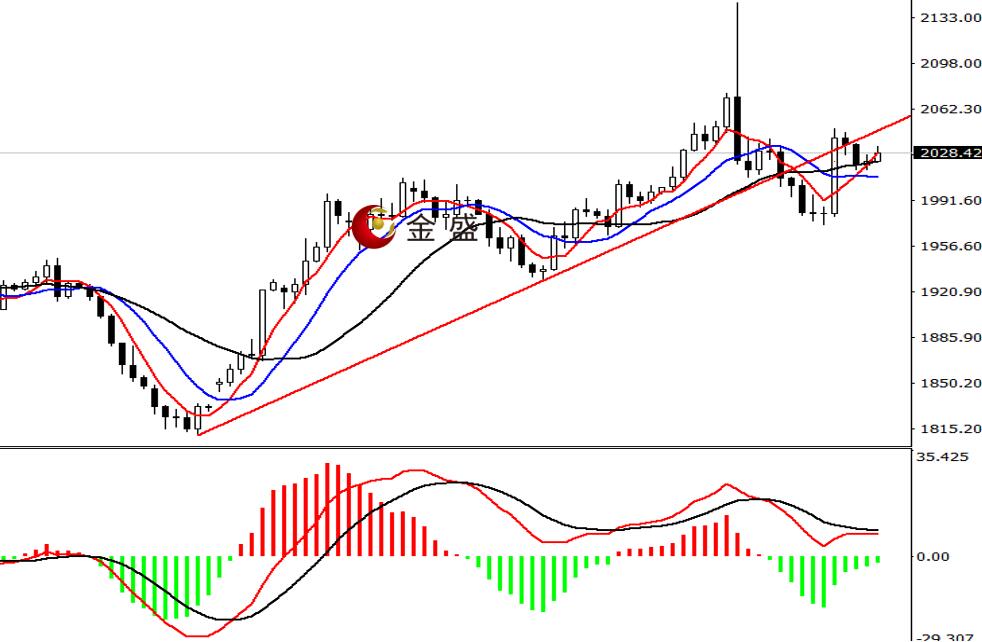前一个交易日,白盘时段,黄金开市即创日内低点2015.85美元,随后**爬升近十美金。晚盘时段,行情依托2020美元关口横盘整理,凌晨出现短暂拉升,价格一小时快速走高逾十美金,创日内高点2033.4美元,尾盘回吐部分涨幅,日图收阳线。均线系统不断收敛,运行在价格下方形成支撑。MACD指标快慢线零轴上方现死叉,做空的动能减弱。黄金依托均线支撑窄幅休整,价格波动在前一日的K线内,近两日形成运行结构。短期盘面偏向震荡,操作上高抛低吸。