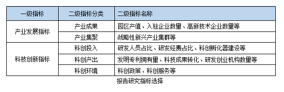 基于兼顾相关性、权威性、客观性、可比较性和可获得性的原则,本报告针对产业园区科创力调研选取产业发展指标、科技创新指标两大类共12个指标,产业发展指标主要从园区产业发展成果、产业集聚度角度分析,科技创新指标主要从园区科创投入、科创产出、科创环境角度深入分析。数据均来源于官方、权威渠道,主要包括**权威机构统计。