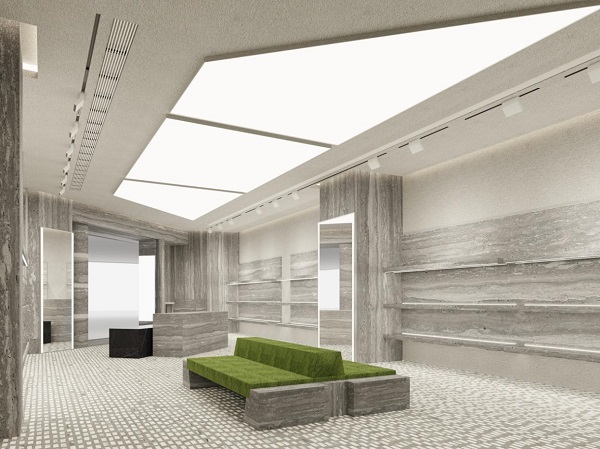 空间整体的粗粝墙面隐现朴拙之感,呈现光线、线条和材料之间巧妙的平衡。草绿色定制沙发长椅作为空间的点睛之笔,让入店顾客能够在购物的同时得以松弛休憩。同时增设了开放的包包陈列台,以更加亲近的方式让消费者体验到品牌的自由美学。空间的不断提质升级,表达GROTTO个乐以品牌“生而自由”的基因为出发点,打破对传统消费空间的理解,展现出明朗的现代风貌。