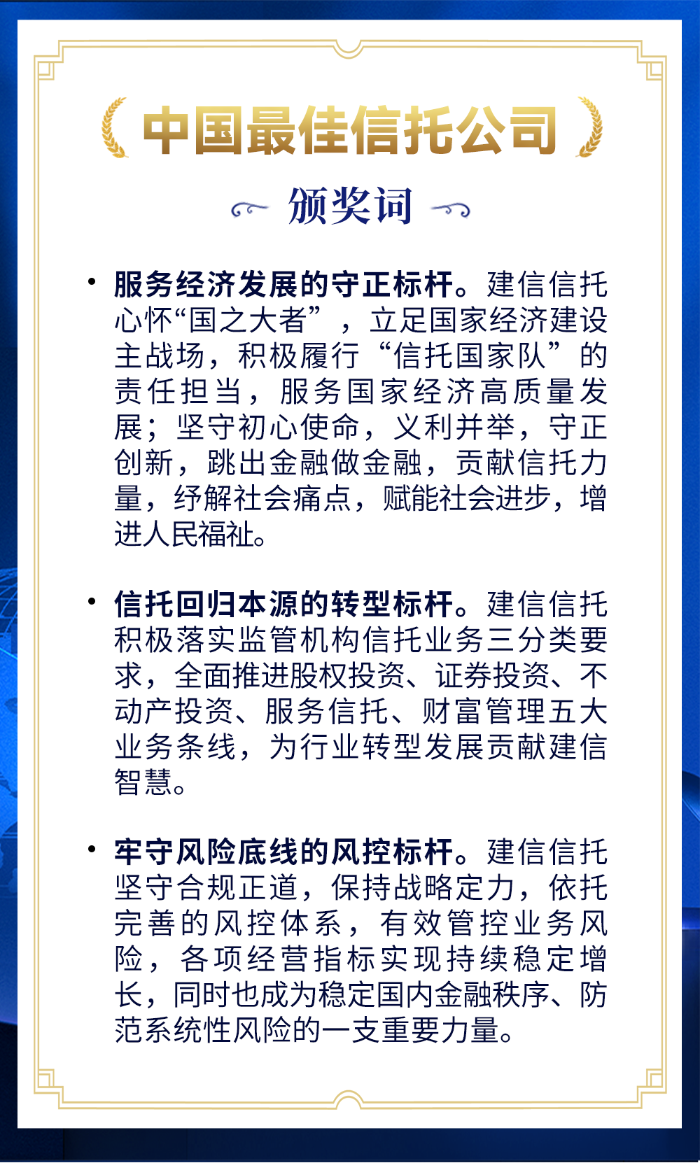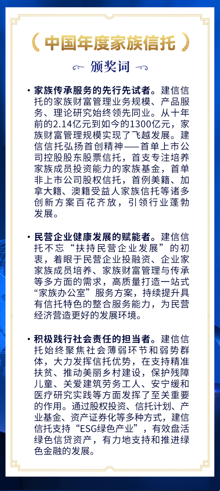 “中国最佳信托公司”“中国年度家族信托”,建信信托包揽两项大奖
