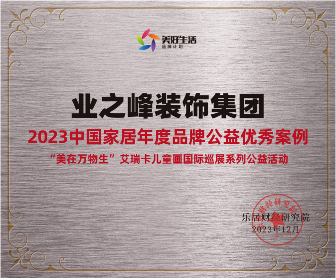 12月12日,2023(第七届)**地产经理人评选荣誉发布会举行。业之峰装饰集团的“‘美在万物生’艾瑞卡儿童画**巡展系列公益活动”荣获“2023**家居年度品牌公益**案例”。