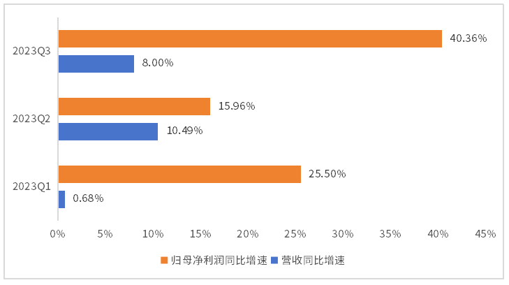 以申万传媒行业为例,今年以来,行业业绩明显转好,营业收入、归母净利润增速均连续三个季度实现正增长,其中,2023Q1-Q3归母净利润同比增速分别为25.50%、15.96%、40.36%,维持着两位数的增速。