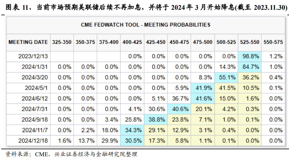 一方面,通胀和就业数据已经给了美联储宽松的“台阶下”。当前市场普遍预期美联储后续不再加息,并将于2024年3月开始降息。