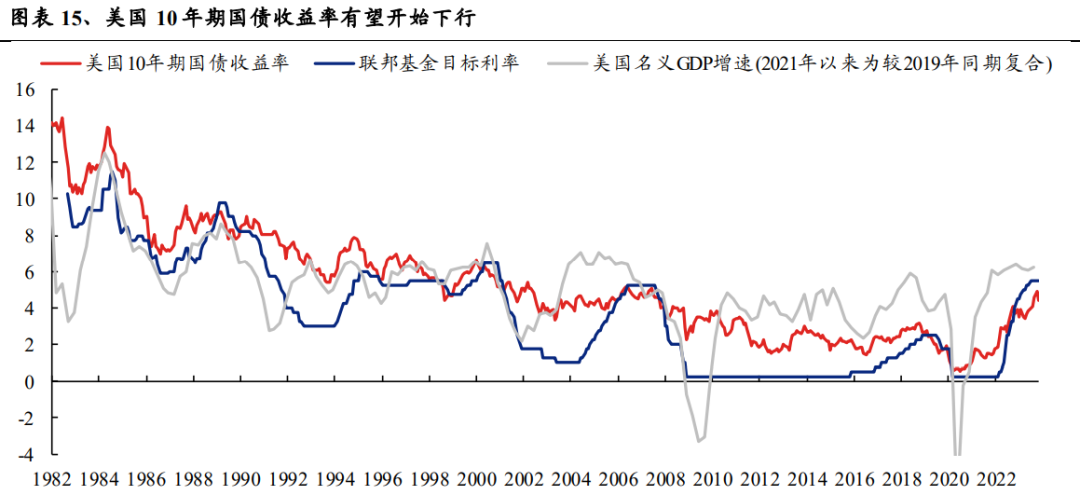 2024 年,随着美国经济进一步回落,同时美联储释放更加明确的边际宽松信号,10 年期美债利率有望继续下行。