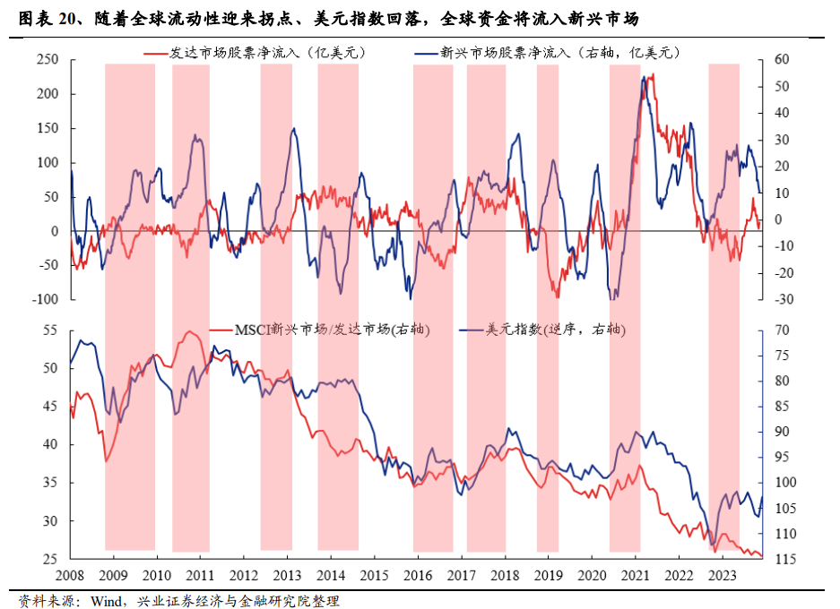 流动性迎来拐点将是2024年海外**的变化。全球流动性拐点临近,股票资产更为受益。并且,相比于发达市场,新兴市场对流动性拐点更敏感,有望迎来全球资金的加配、回流。