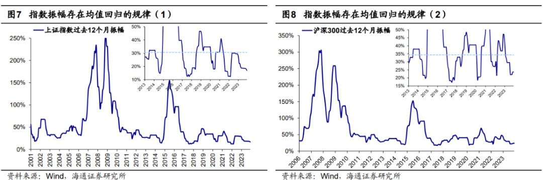 事实上,股市振幅的走势也犹如钟摆,存在均值回归的运行规律。当前A股振幅或已类似于14年中,市场整体已呈现明显的低波动,上证综指**一年振幅为16.9%,接近于14年低点15.0%;沪深300振幅为23.7%,同样接近14年低点19.7%。(数据来源:Wind,海通证券)