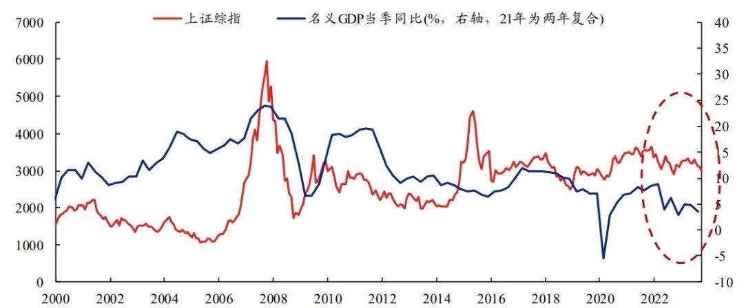 2024年新旧动能切换达到阶段性平衡,旧动能对经济的冲击减弱,而新动能的活力上升,叠加价格回升拉动名义GDP加速,**经济将有望进一步企稳修复,**股市盈利弹性恢复的机会将再次回归。
