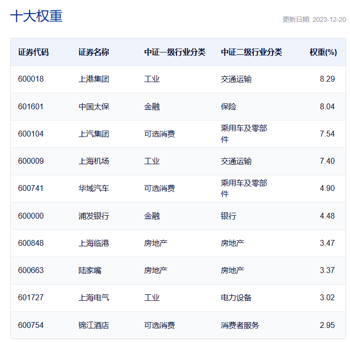 首先是中证上海国企指数,前十大权重股主要集中在交通运输、保险、银行、房地产等板块,累计权重之和为53.46%。