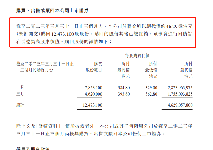 腾讯的回购已经司空见惯。腾讯一季报曾详细披露,今年1月至3月,腾讯合计回购了1247.31万股股份,合计总代价46.29亿港元,回购**价329港元,回购**价393.8港元,回购股份均已被注销。