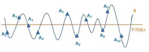 既然市场是波动的,就有超过平均价的机会。比如下图中的B,这个时候B代表的价格是大于平均价A的,所以这时候的定投是盈利的。