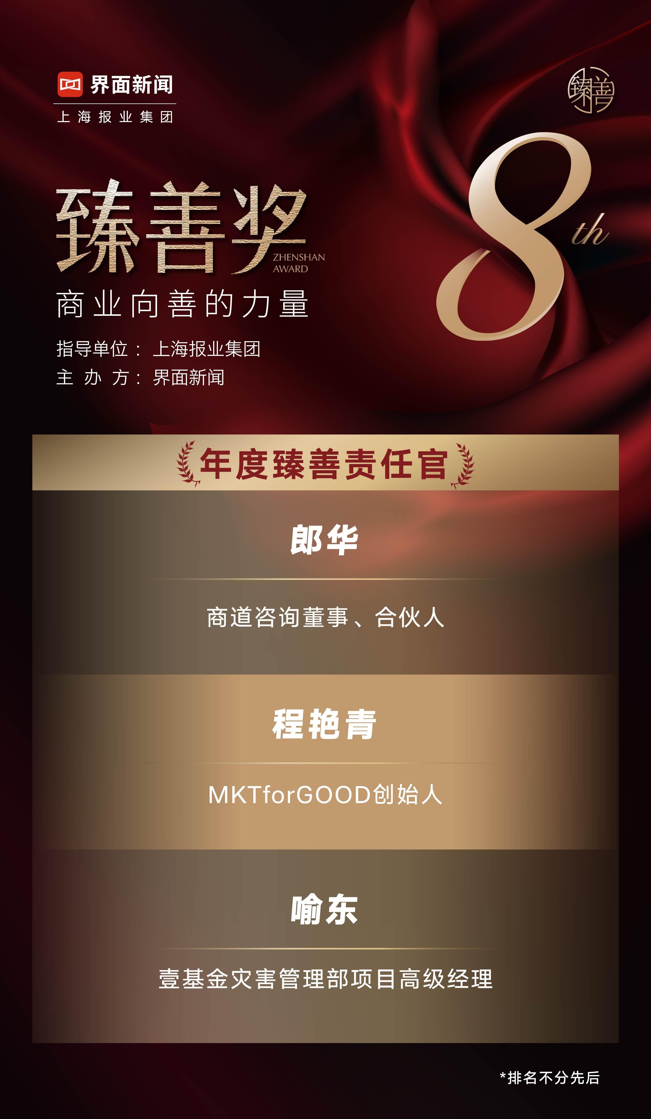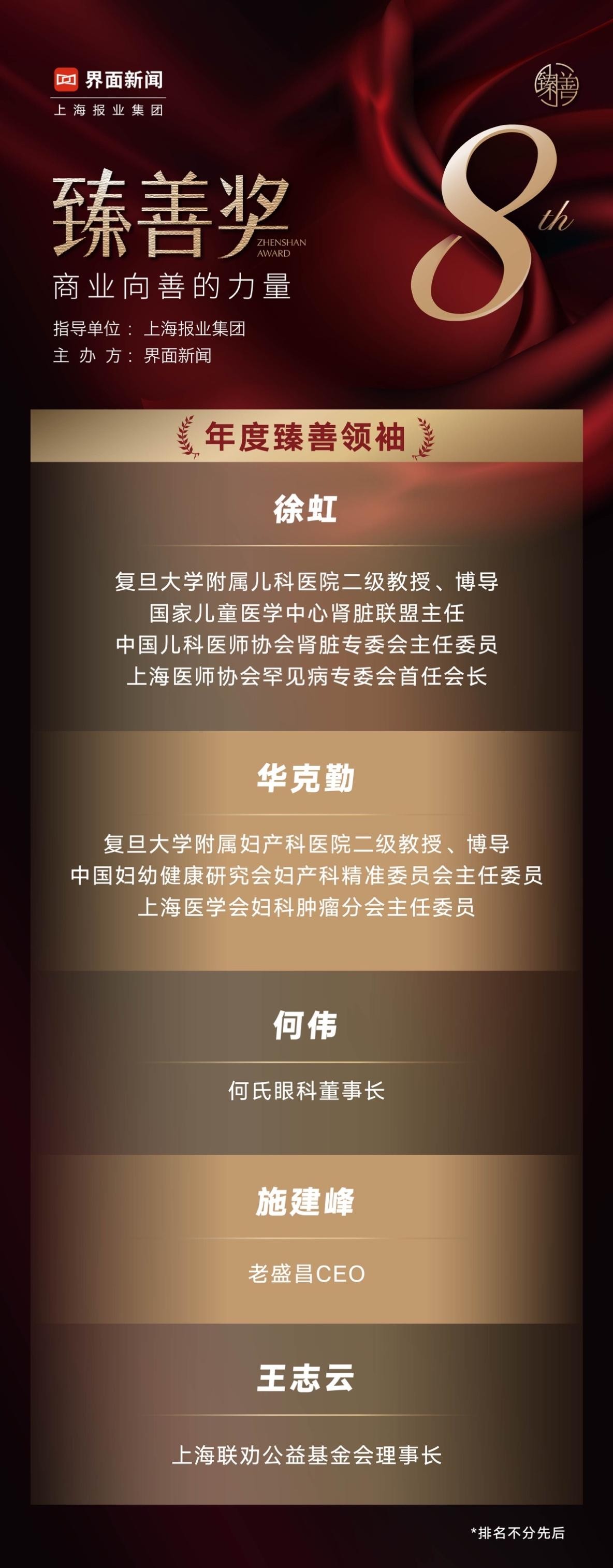 5位臻善**则分别深耕于医疗事业、公益基金会、食品等领域——在不同的领域内,他们充分发挥了**精神和领导力,促进**的公益慈善事业发展,督促企业及组织积极肩负社会责任,向善发展,同时以技术创新助力社会平等提供了清晰的可循路径;
