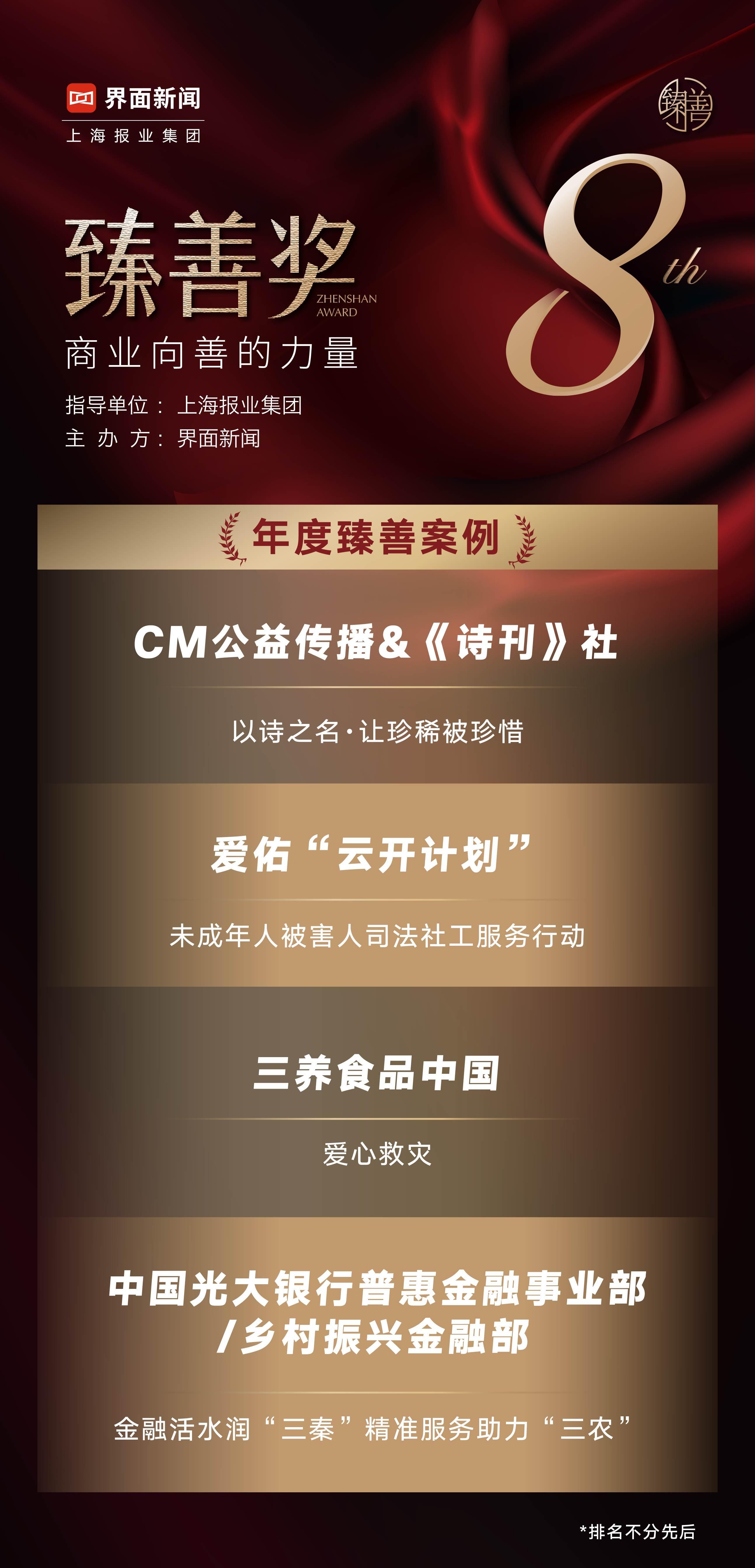 由上海报业集团 | 界面新闻发起的2023【臻善奖】【透明慈善公益基金会】【杰出慈善案例】终榜于12月13日举办的2023【界面财经盛典】上公布并颁奖。