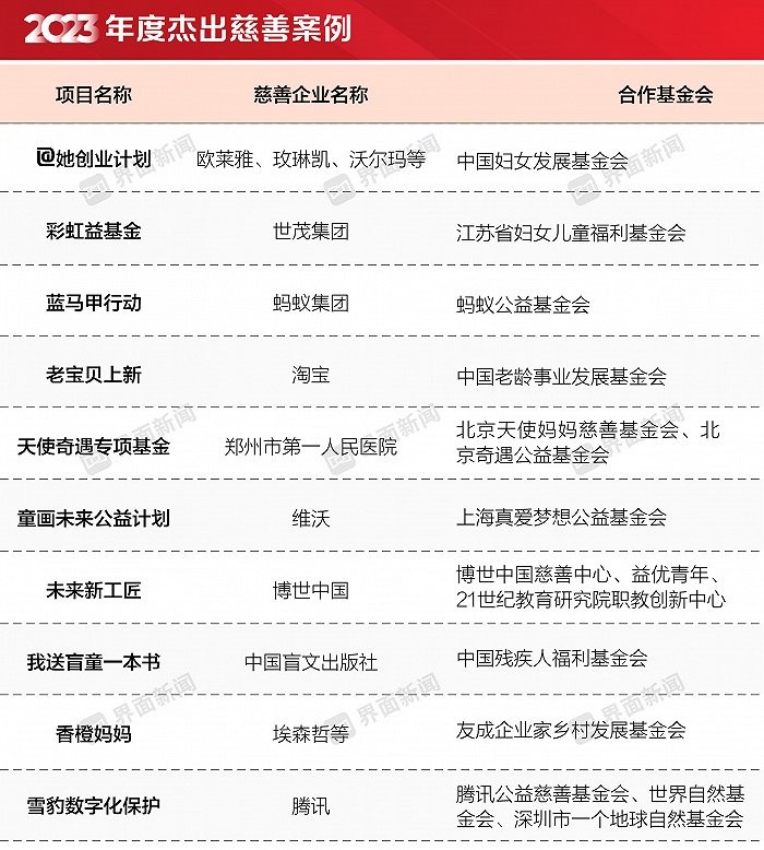 界面新闻「2023年度杰出慈善案例」旨在寻找企业与慈善公益基金会合作的典范。界面新闻通过案例申报、桌面调研、企业或基金会走访等方式,再结合算法,从项目规模、受益群体、综合影响力、创新性、前瞻性、发展潜力等方面进行综合评价,**产生10个入选案例。