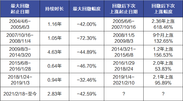 以沪深300指数近二十年里的几轮指数调整情况进行回顾,可以看出,**回撤幅度上,像本轮回调40%左右的情况,在过去二十年里的5次大回调历史中,就出现过3次,还有1次高于40%的幅度,1次低于40%。