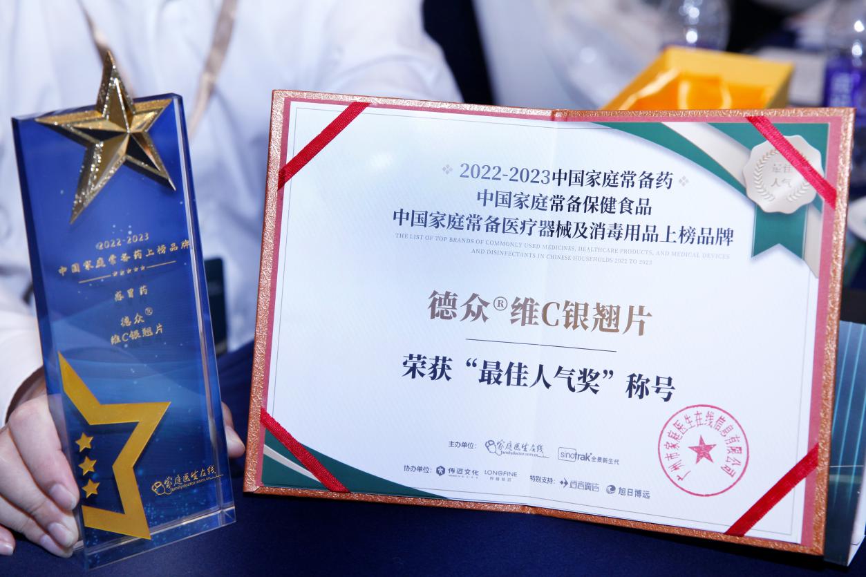 近日,被誉为“家庭常备药品风向标”的“2022-2023年**家庭常备药“榜单在广州发布,该活动由家庭医生在线、全景新生代共同主办。本次活动评选共经历了初步审核、大数据及市场调查赋分、大众投票得分、产品公示等环节,以保证上述榜单的指导性、大众性、合理性和公正性。国药集团德众(佛山)药业有限公司生产的德众维C银翘片凭借悠久的历史、**的功效、稳定的药品质量、良好的市场成绩及广泛的群众认可基础,不仅成功入选榜单,更荣获了“**人气奖”称号。