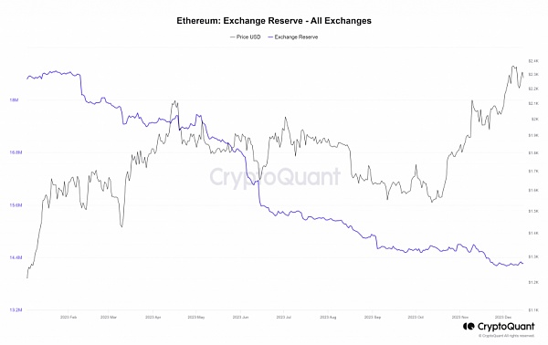 相比于 BTC,ETH 在交易平台的余额波动性较小。自 2023 年 2 月以来,ETH 在交易平台的余额一直处于下降趋势。在 12 月 11 日至 13 日期间,ETH 在交易平台的余额也出现了小幅反弹,但反弹出现在市场价格下跌期间和之后。这表明,有部分投资者在市场短暂下跌之后选择将 ETH 转入交易平台**。