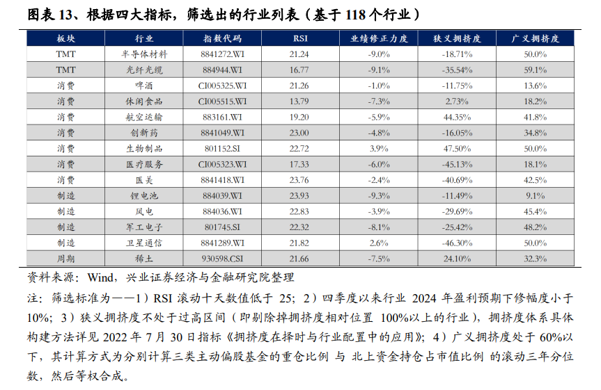 考虑到四季度以来市场整体盈利遭遇下修、部分板块筹码拥挤度仍然较高等因素,兴业证券在此通过超跌程度(RSI指标)、盈利修正力度(四季度以来盈利修正情况)、狭义拥挤度(短期交易拥挤度)、广义拥挤度(公募、外资持仓拥挤度)四大指标,选出超跌程度明显、盈利下修幅度较小、狭义拥挤度和广义拥挤度中等或较低的行业。