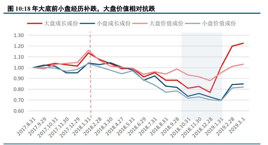 中信建投研报复盘历史显示,底部前大盘价值相对抗跌,小盘股存在补跌压力。从18年以来的极端大底进行分析,可见在历史的极端底部区域,大盘价值最抗跌,小盘价值其次,大小盘成长有补跌的压力:18年熊市前半段四种风格均匀下行,6月开始除大盘价值外的风格均经历补跌。
