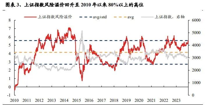 其次,风险溢价上,上证指数的风险溢价已经回升至2010年以来83.4%的历史高位,再度突破历史均值 1倍标准差的高位,沪深300、中证500指数分别达到2010年以来91.8%、93.6%的极高水平,创业板指的风险溢价水平更是一度突破历史新高。