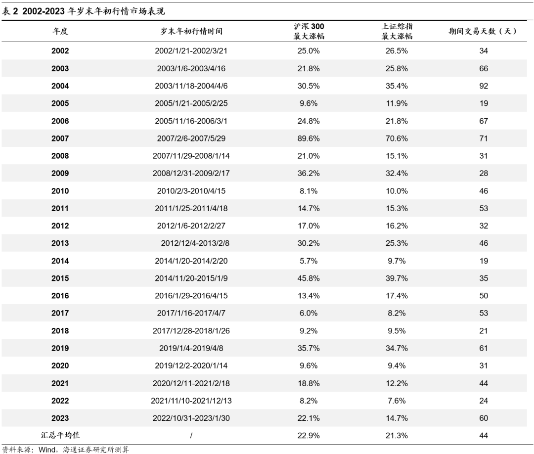 海通证券复盘历史认为,在A股历史上哪怕是震荡市或者熊市期间,年度视角下依然存在至少两次10-15%左右涨幅的上涨机会,例如2011年、2018年和2022年。从历次岁末年初躁动行情回顾来看,岁末年初行情通常每年都有,背后的原因源自于岁末年初往往是重大会议召开时间窗口,同时11月到3月A股基本面数据披露少,开年投资者的风险偏好相对更高。