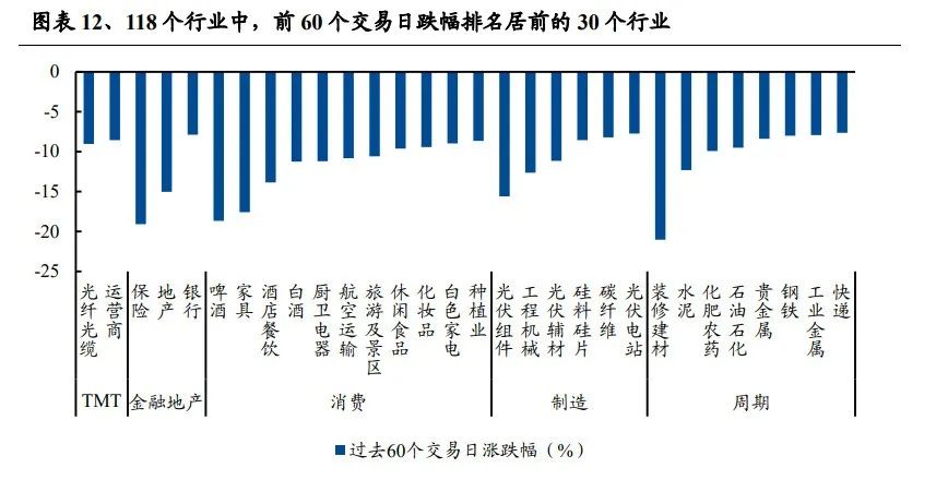 兴业证券依据市场投资习惯,将**场划分为118个细分行业,从这一维度来看,我们筛选出前60个交易日跌幅居前的30个细分行业:金融地产(保险、地产、银行)、消费(啤酒、家具、酒店餐饮、白酒、厨卫电器、航空运输等)、制造(光伏组件、工程机械、光伏辅材等)、周期(装修建材、水泥、化肥农药等)。