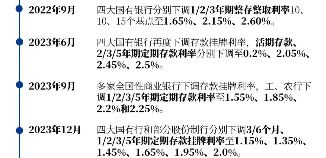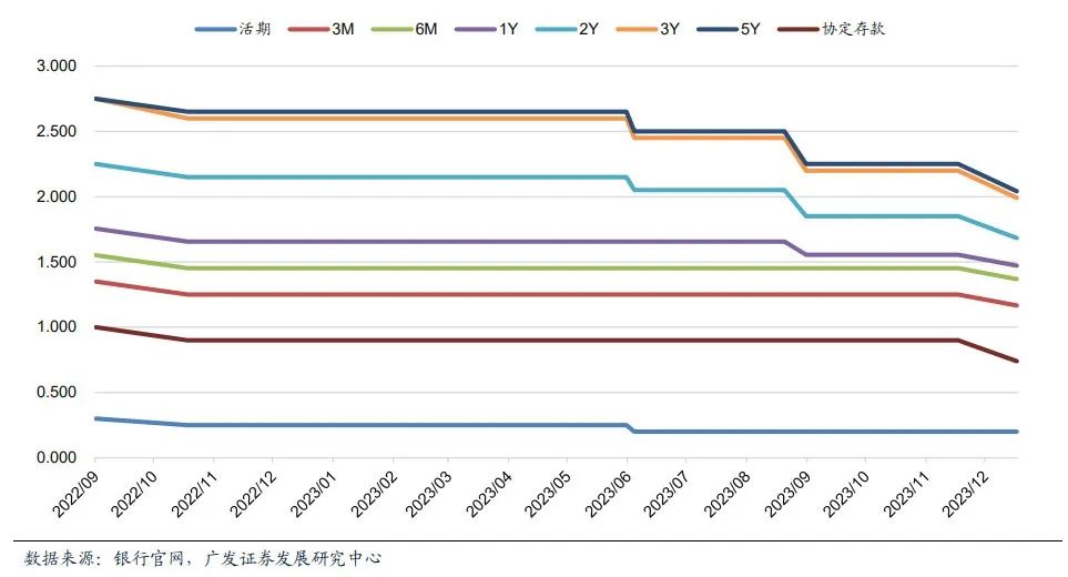 本轮下调延续了“期限越长,降幅越大”的规律,1年及以内、2年、3年、5年期的定期存款挂牌利率分别下调10bp、20bp、25bp、25bp。距2022年9月**轮调降前,短短一年半内,五年期利率降幅最为显著,从2.75%降至2.0%;其余期限也有不同程度的下降。