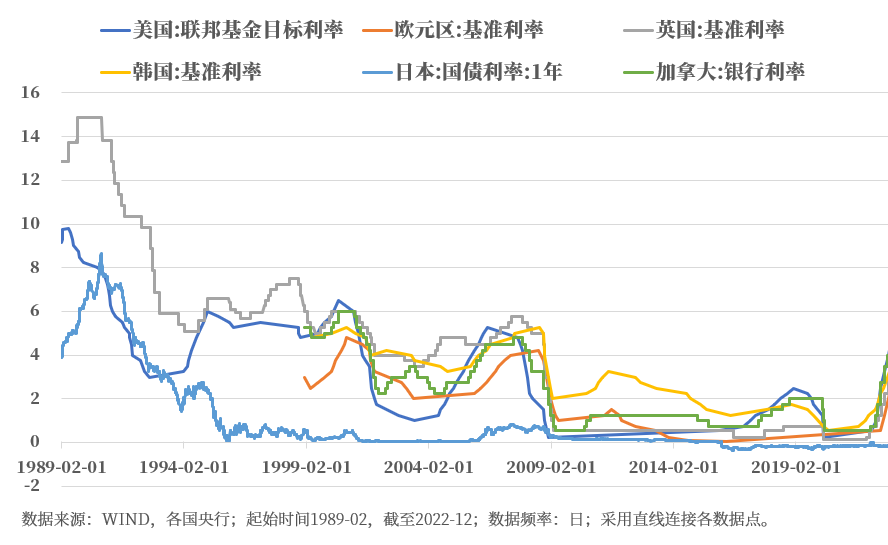 图:1989-2022年全球代表**整体利率下行