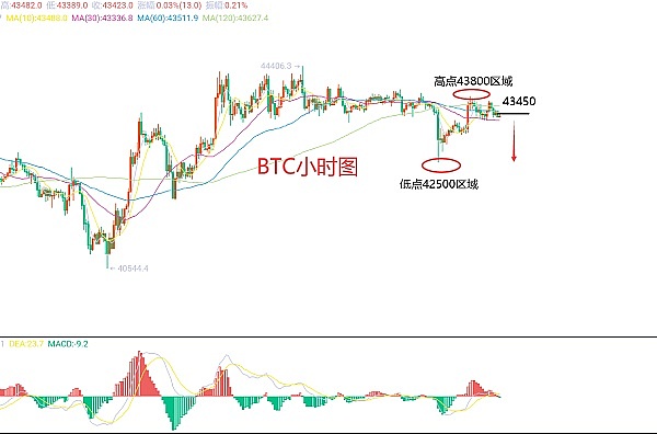 12月26日比特币(BTC)合约技术面分析:今日方面,大周期日线级别昨日报收小阳线,K线形态上单阴单阳,价格在均线上方,附图指标死叉缩量运行,这样来说短时间价格还是会有震荡的局面出现,原因也简单,指标给出的信号上是有回撤需求的,但价格没有回合力度,一直处于高位横盘整理,抗跌;短周期小时图昨日高点在43800区域,低点42500区域,今日先还是关注区间的破位情况,当前K线形态连阴下跌,附图指标死叉向下,那么日内是有下跌修正的需求,因此今日BTC短线合约交易策略:现价43450区域直接空,止损43800区域,目标看43000-42800区域;回撤42700-42800区域多,止损42500区域,目标看43300-43500区域;