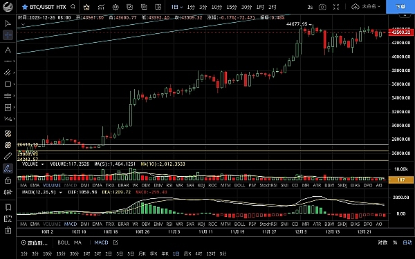 大饼昨日整体呈震荡上行走势,期间价格回踩至43000附近止跌再次反弹,**触及43800附近受阻回落,恭喜跟上昨日思路的朋友,目前币价在43440附近运行,四小时级别行情止跌反弹拉回起跌点,可见多头支撑力度挺强,macd空头减弱双线死叉状态,短期行情反弹受阻有回落需求,关注ma7支撑情况,若破位则还有下行的需求,日线级别k线收十字星阴线但回踩力度预计不会太大,高位震荡后行情预计会再度迎来走高,低多的单子可继续持有,思路建议逢低做多为主高空为辅,上方压制43800-44400,下方支撑43400-43000
