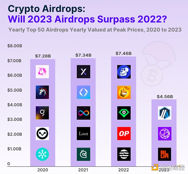2023 年进行的空投中,有 13 次进入前 50 名。2023年分发了按 ATH 价格算价值 45.6 亿美元的**。