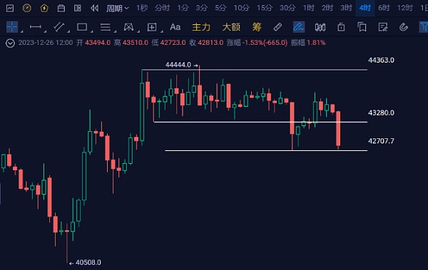 四小时整体来看是属于上涨趋势之后的回调,因为上方的压力很重,所以需要回调蓄力,同时把做多的人赶下车。下方也是密集成交区形成的压力位,目前来看,BTC短期的走势震荡的概率比较大,大幅下跌的可能性很小。