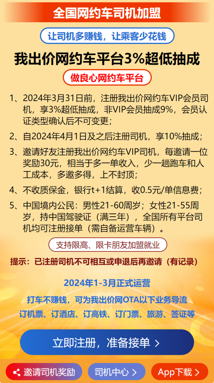 哪家网约车平台抽佣少?3%我出价网约打车 ----做良心网约打车平台