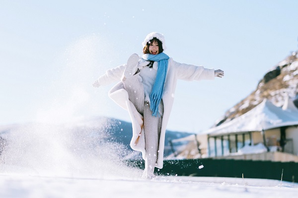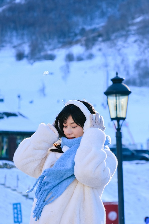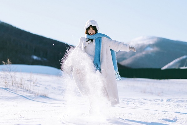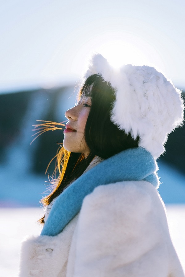 摄影是做减法,拍摄氛围感人像更是如此,所以可选择比较空旷的场景进行拍摄,简单的背景才能拍出干净清新的照片。避免正午太阳直射的时候拍照,人物没有立体感,**选择太阳入射角度较小的下午拍摄,此时雪地反光较弱,在阳光的渲染下,呈现出淡淡的金色,照片会呈现出不同的冷暖对比和强烈的视觉效果。